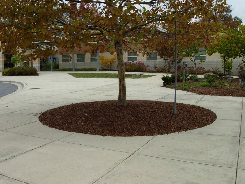 Bethesda Elementary School, November 2007, an Eastern Sycamore with volcano mulching.