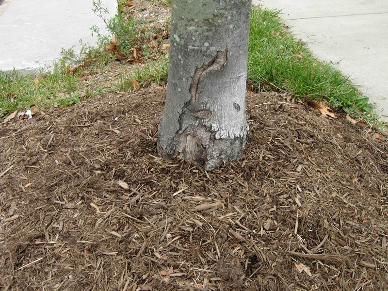 Mulch should not contact a tree trunk so that the base of the trunk will remain healthy.